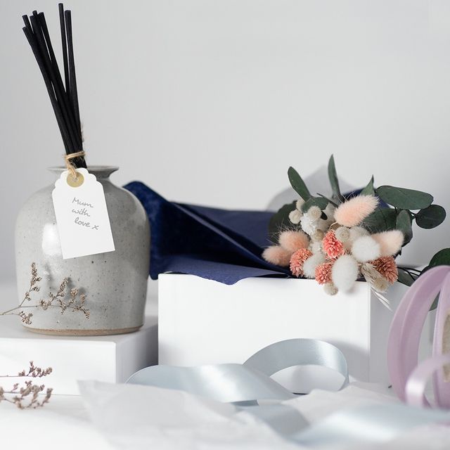 A hand-crafted pamper box with a dried rose bouquet, Dewnamis cbd oil, notebook and pen.